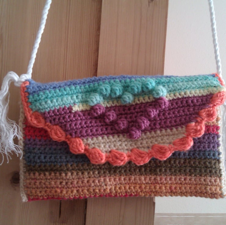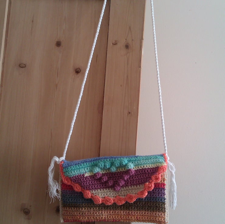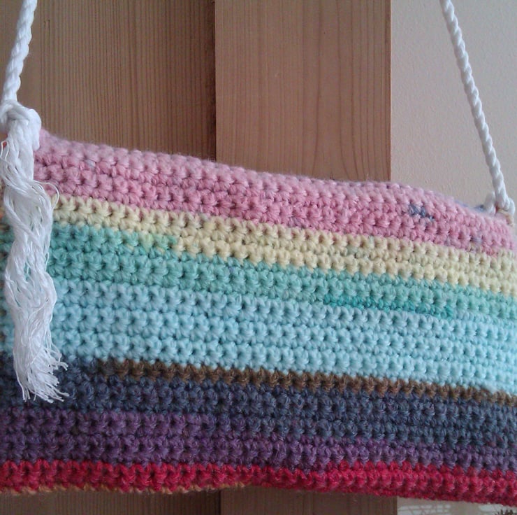 I wanted a small shoulder bag for putting my house keys in during the school runs in the summer (few summer dresses have pockets!)...I made two with the multicoloured wool that I had as at first I couldn't decide which bag I wanted to keep for my own use.