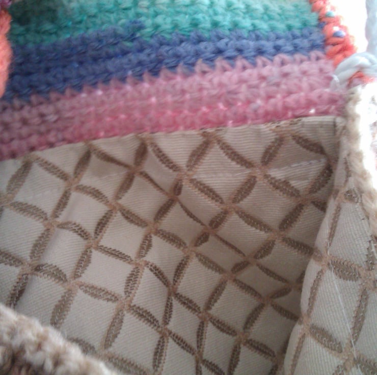 Crocheted shoulder bag with heart design and long rope handle. Inside has been lined with curtain fabric.