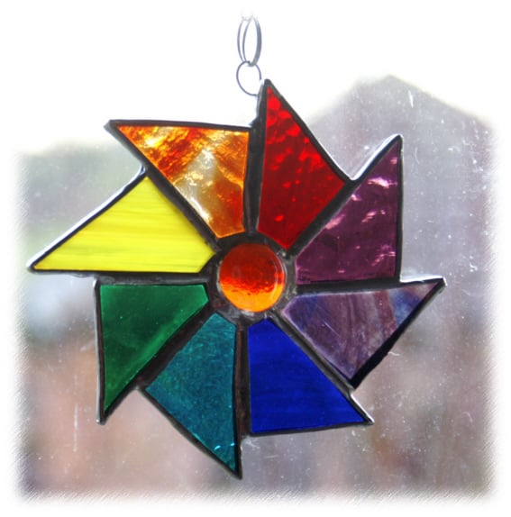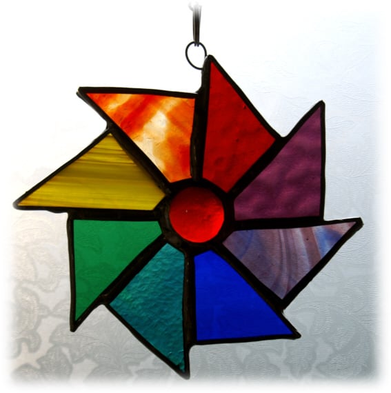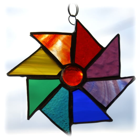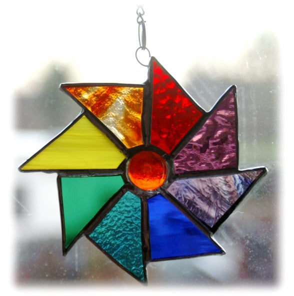 This is an 8-point wheel made from triangles of glass in all the lovely colours of the rainbow.