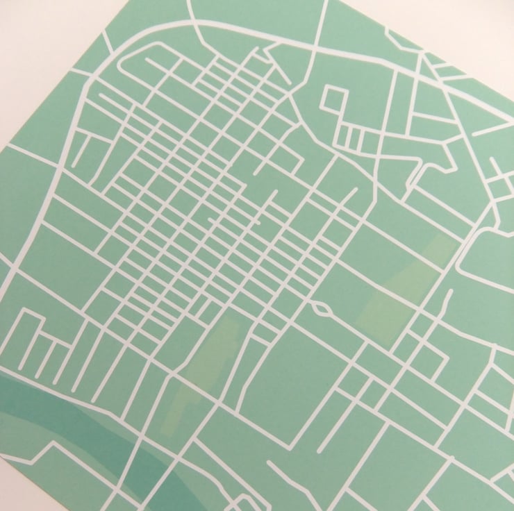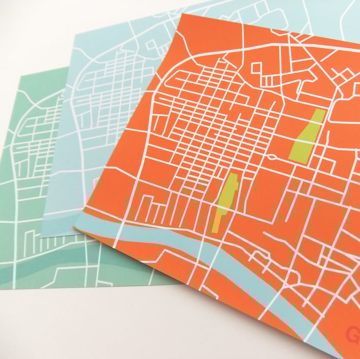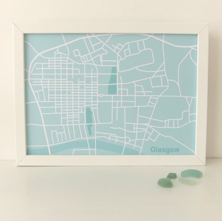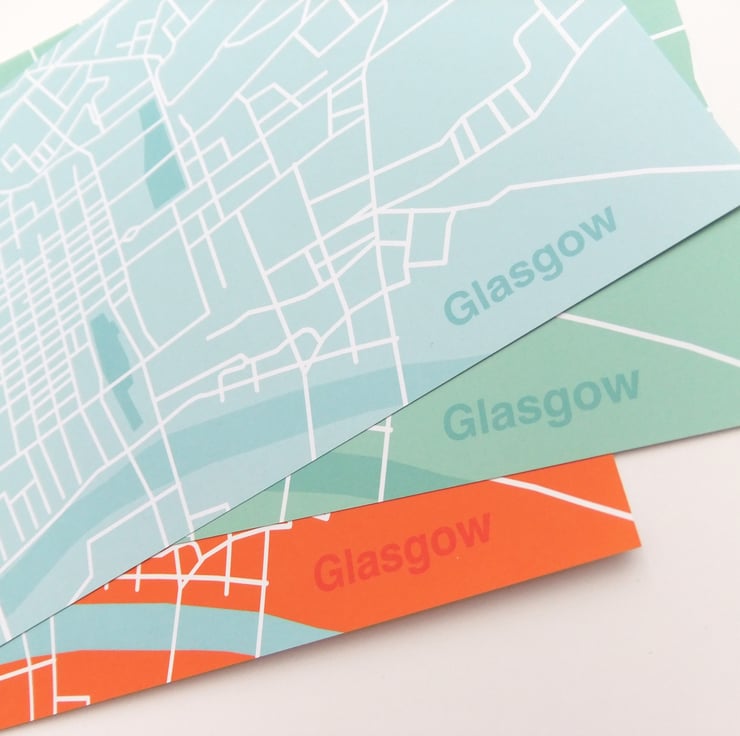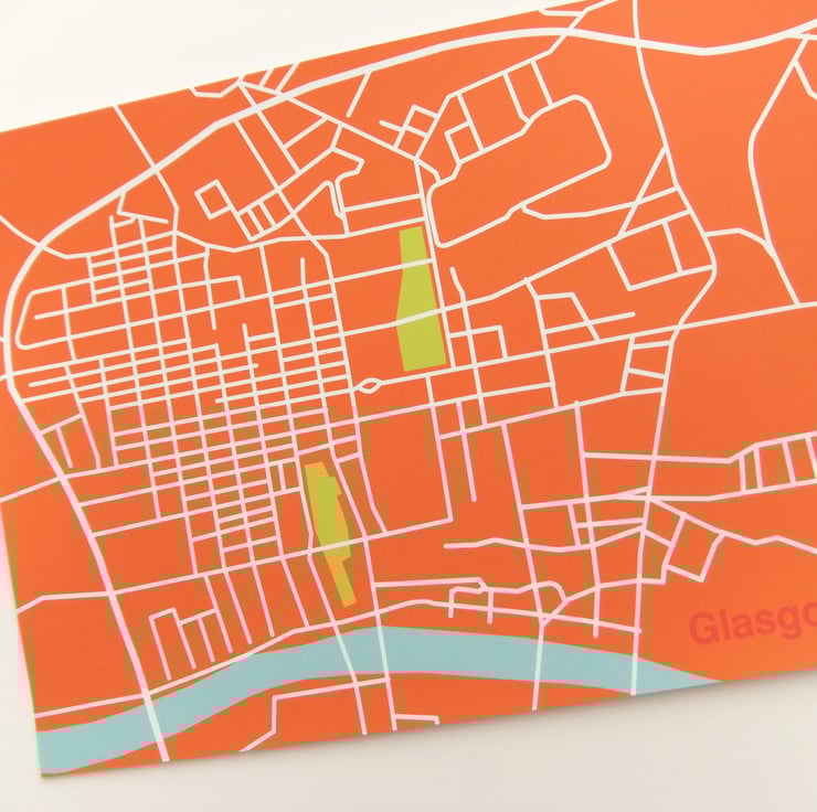 The map covers the City Centre and Merchant City and shows the River Clyde and City Centre railway stations. The print is available in 3 lovely colours - bright orange, pale duck egg blue and minty green. If you'd like it in a custom colour, drop us a note as it may be possible.