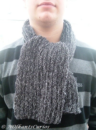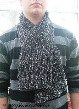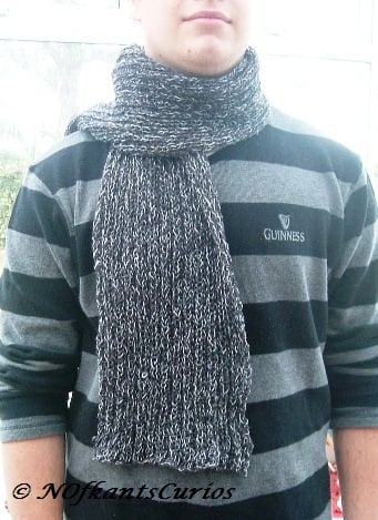 The scarf is in a classic style. Knitted on a large needles to give a loose stitch, in an alternating wide rib design, allowing the scarf to gather and therefore give a soft and thick feel the the scarf, without the weight of a heavy thick yarn. There are no seams or joins in the scarf.