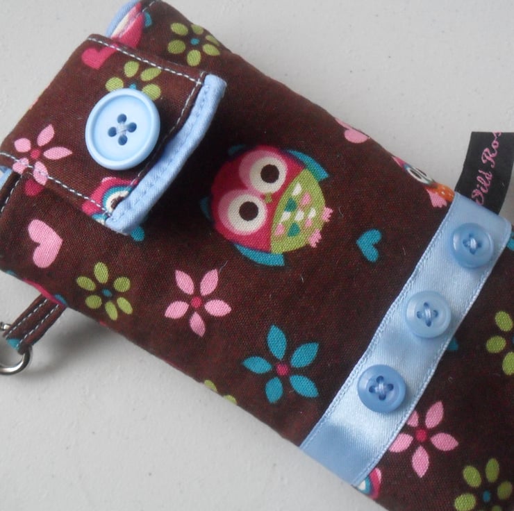 A lovely handmade camera case in a cute owl fabric. The case is trimmed with a pale blue satin ribbon, toning buttons. and the tab closes with Velcro . It is lined in blue glazed cotton and is interlined and interfaced for a softly structured appearance. There is a layer of wadding to protect your camera. This handmade camera case has a handy removable blue ribbon wrist strap.