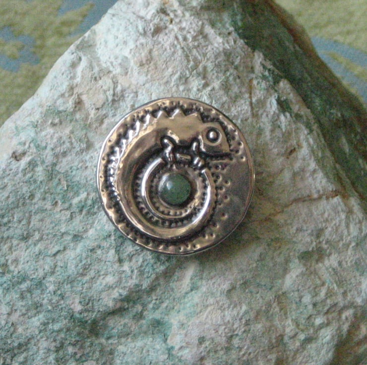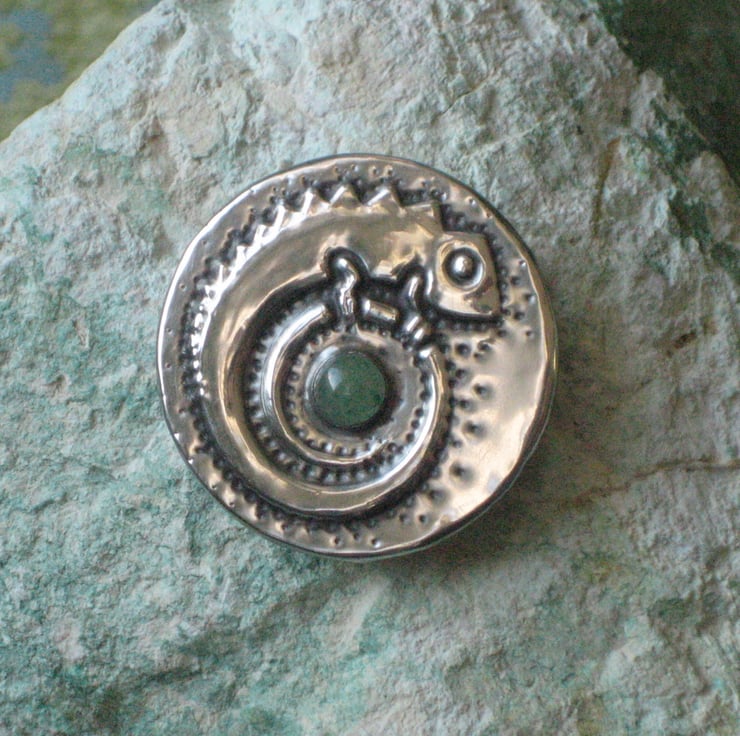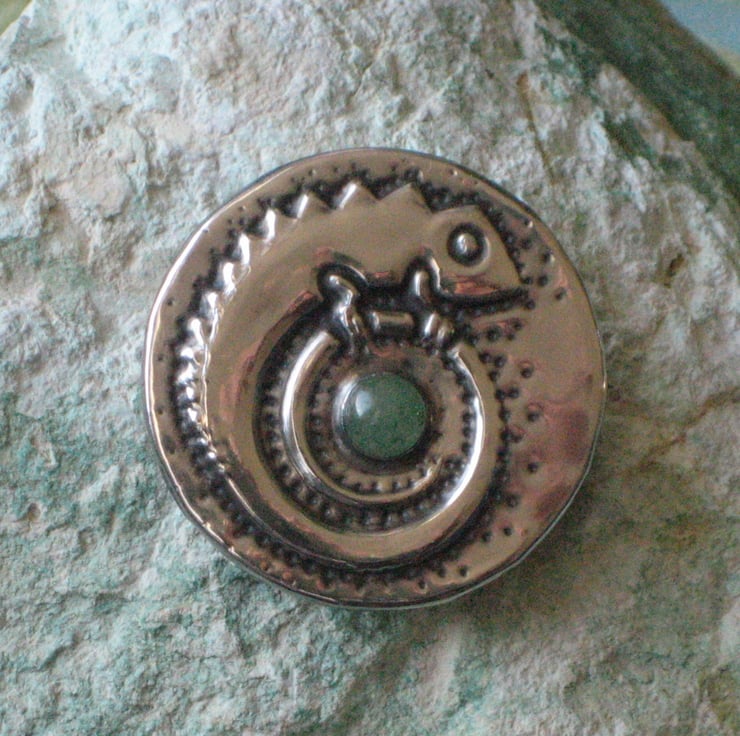 Reserved. This unique little brooch has been handmade in modern lead-free pewter, and features a pretty green aventurine gemstone.It measures 33mm (just under 1.5 ins) across and has a 25mm pin with safety catch. Comes gift-boxed.