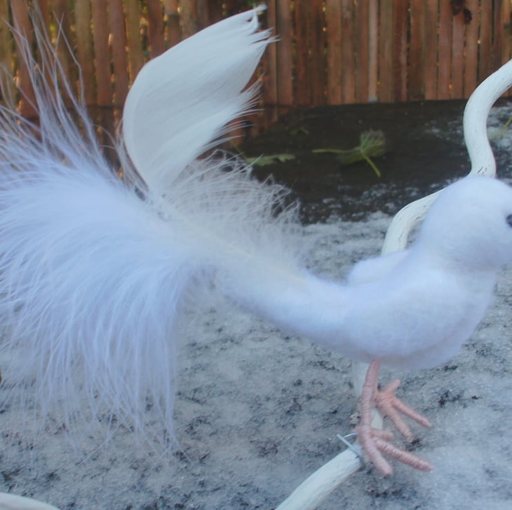 The dove is finished with little bead eyes and wire legs covered with embroidery silk.