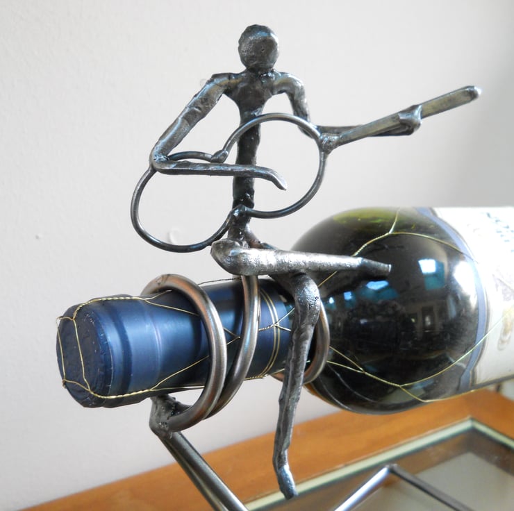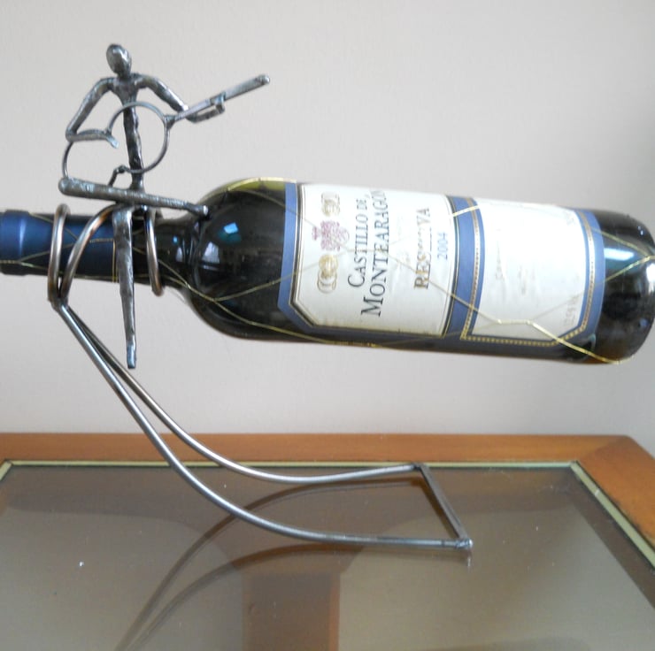 This is a rocking wine bottle holder with a sculptured figure playing a guitar but you can have a violinist or figure reading.The holder balances when the bottled is inserted into the holder. If you don't finish the wine, cork it, insert it into the holder but pull it out a bit to balance. I real eye catcher sitting on your table.