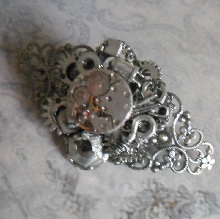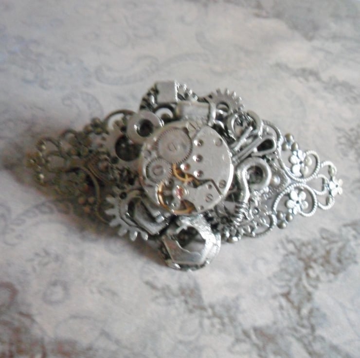 An unusual Steampunk hair barette created from a antiqued bronze filigree base with a silver tone cog with levers. To the centre is a vintage watch movement with all the wheels and gears on show.