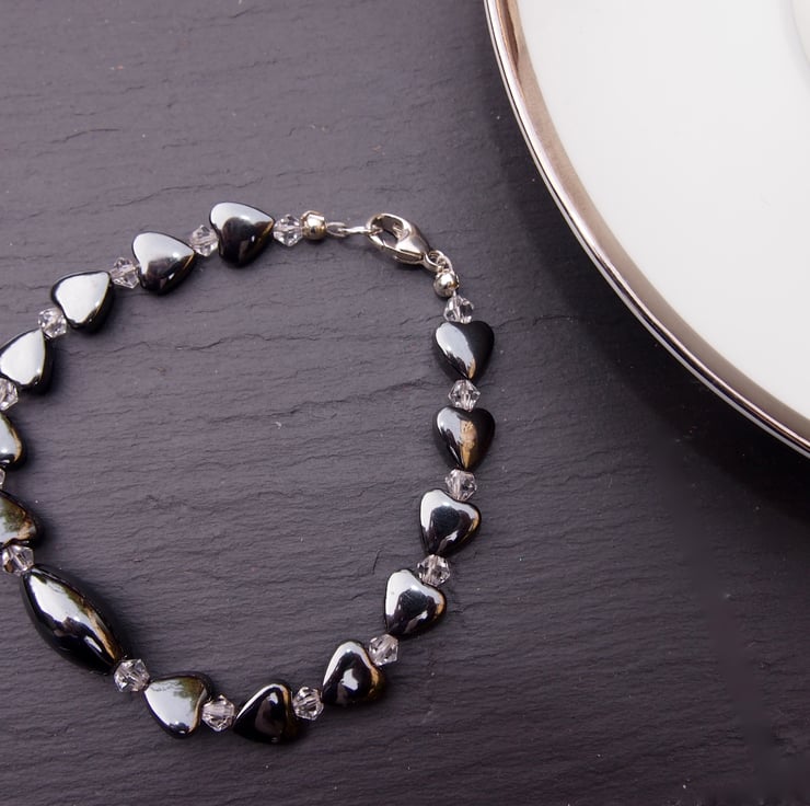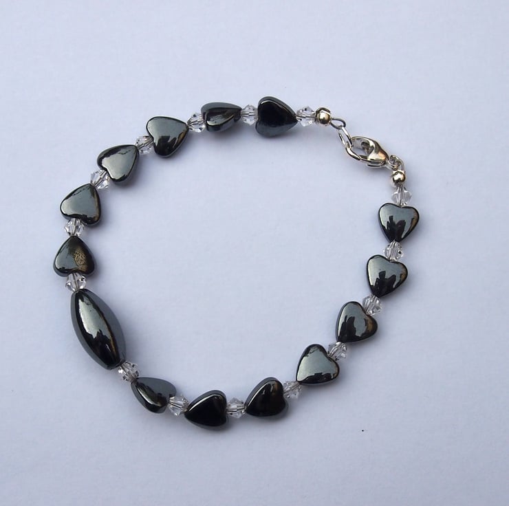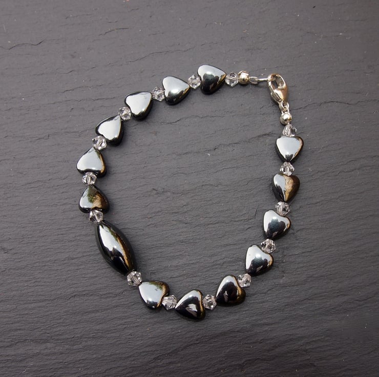 Delicate bracelet of shiny steel-grey haematite hearts interspersed with tiny Swarovski crystals and a haematite feature bead, with a sterling silver lobster clasp. The bracelet is approximately 19cm long, but I could add a sterling silver extension chain if required - just message me to ask.