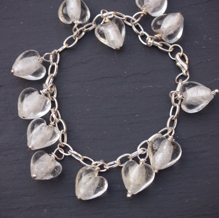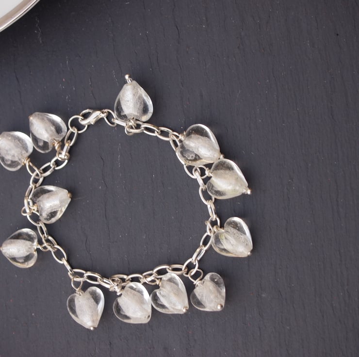 Silver-plated charm bracelet with twelve silvered glass hearts hanging from a simple chain with a simple lobster clasp. Approximately 19cm long.