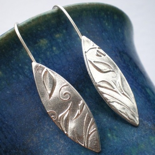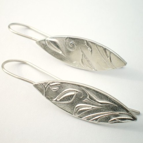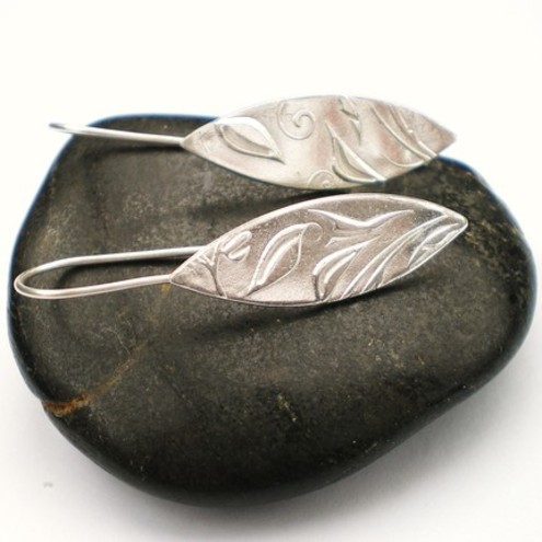 Pretty fine silver leaf shaped earrings with a trailing flower and leaf texture.