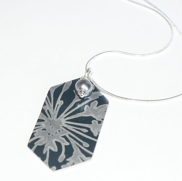 A striking pendant made from hand printed and dyed aluminium that has been cut into a contemporary jewel shape by hand. The pattern is modern floral and the necklace has a grey bead detail. It is hung from a 16 inch sterling silver chain. Please note your necklace may vary slightly from the image as I will make it to order.