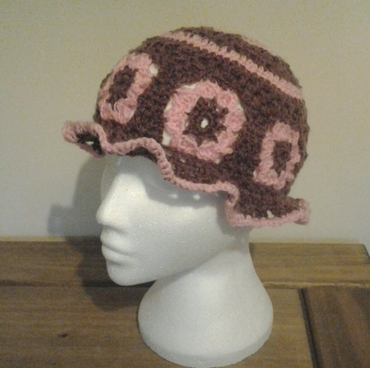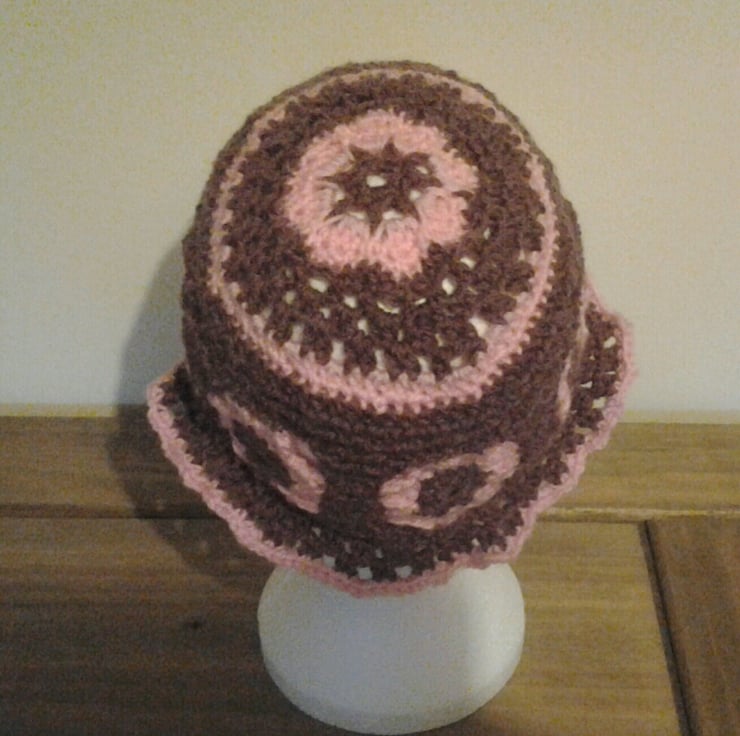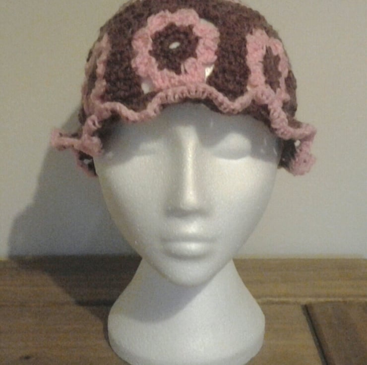 Beautiful crochet hat with pink flower design and ruffled rim.