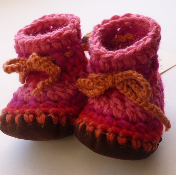 Crochet tie cord keeps boots securely on little feet.