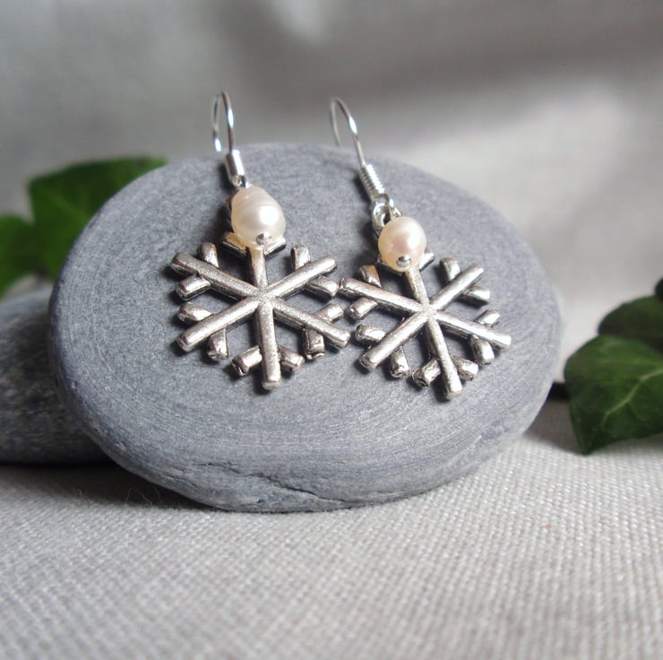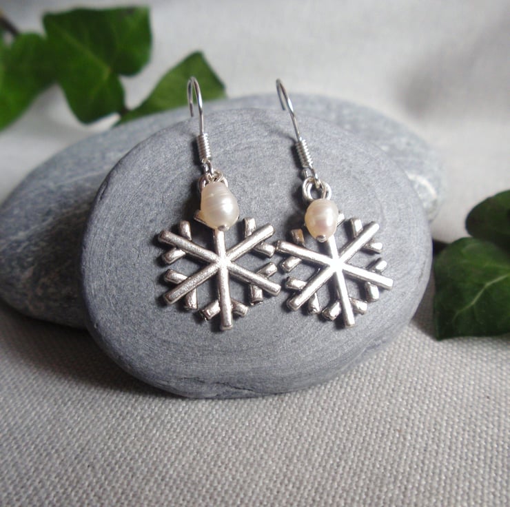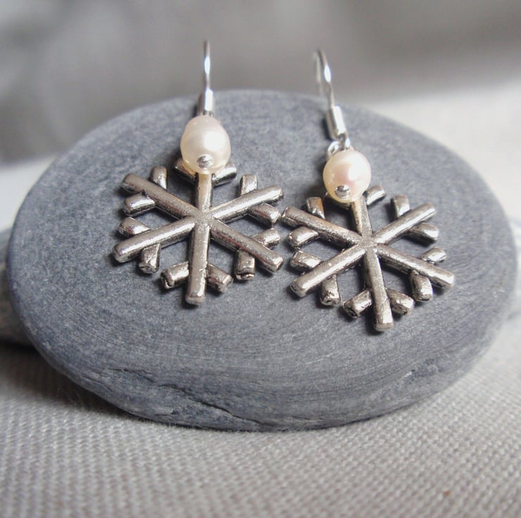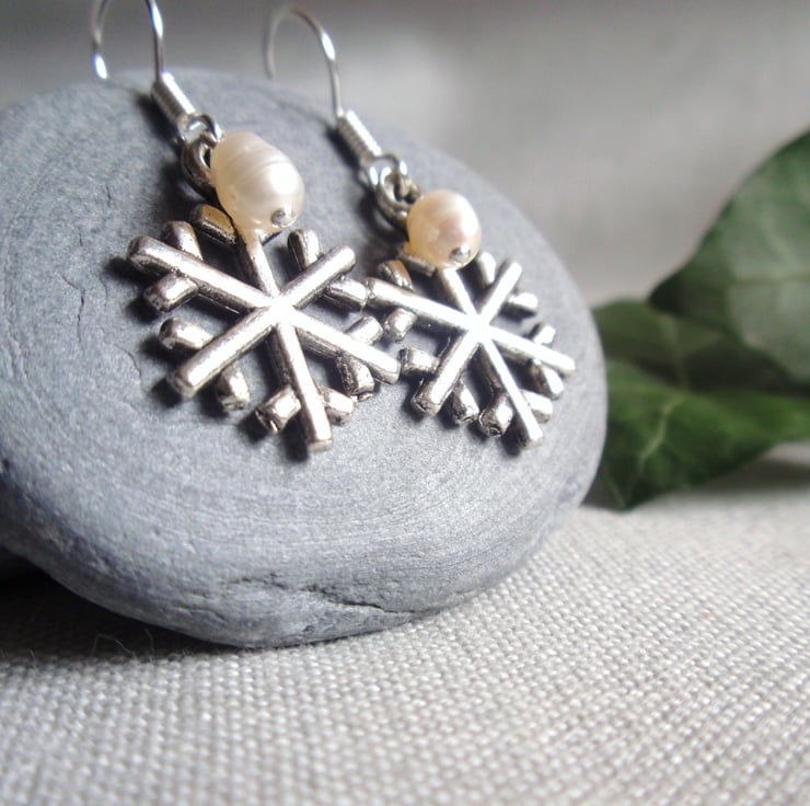 Little silver tone snowflakes embellished with an ivory freshwater pearl, great Christmas earrings. The snowflake is 1cm across and made from tibeten silver, it is slightly oxidised so is an edgy little snowflake. Hook fastening is silver plated. There is a matching pendant available in my shop, and other christmas jewellery.
