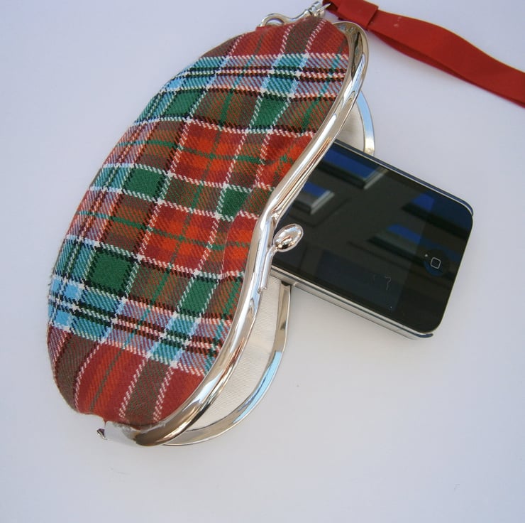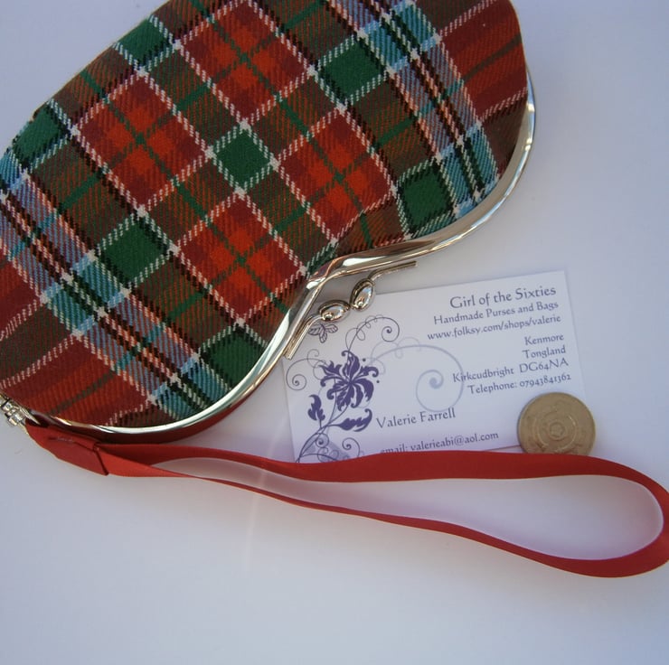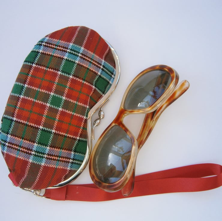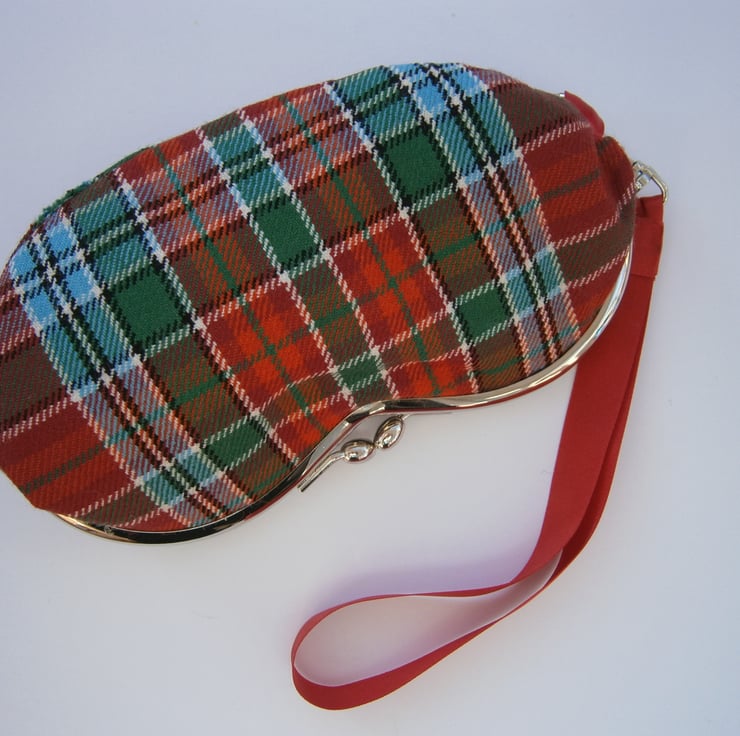 Charming little wristlet purse for sunglasses or mobile phone in lovely tartan fabric with contrasting lining and removable wrist strap. Measures approx 7x3.5