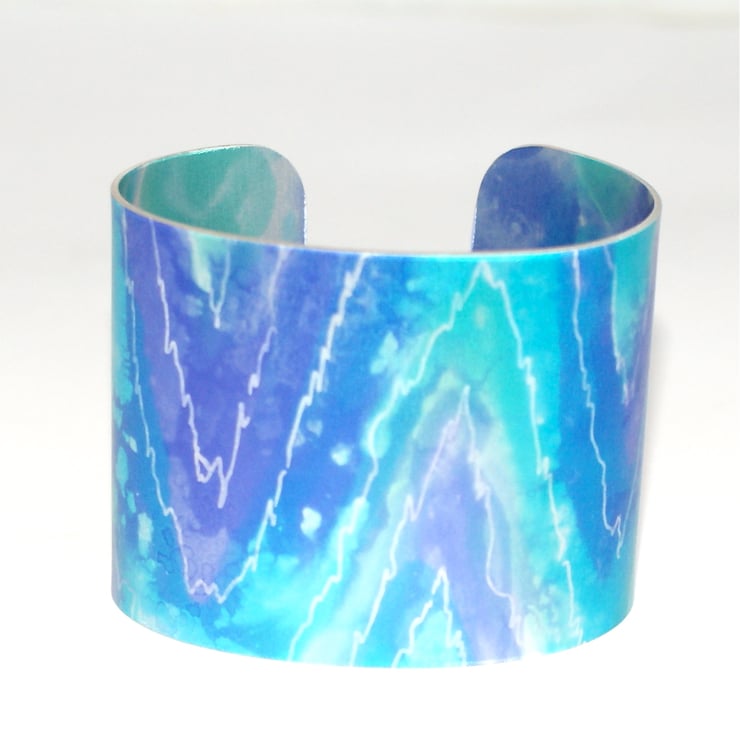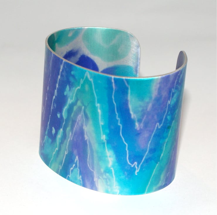 Funky anodised aluminium cuff that I have painted with purple and turquoise to create a watercolour style zig-zag / ikat effect.