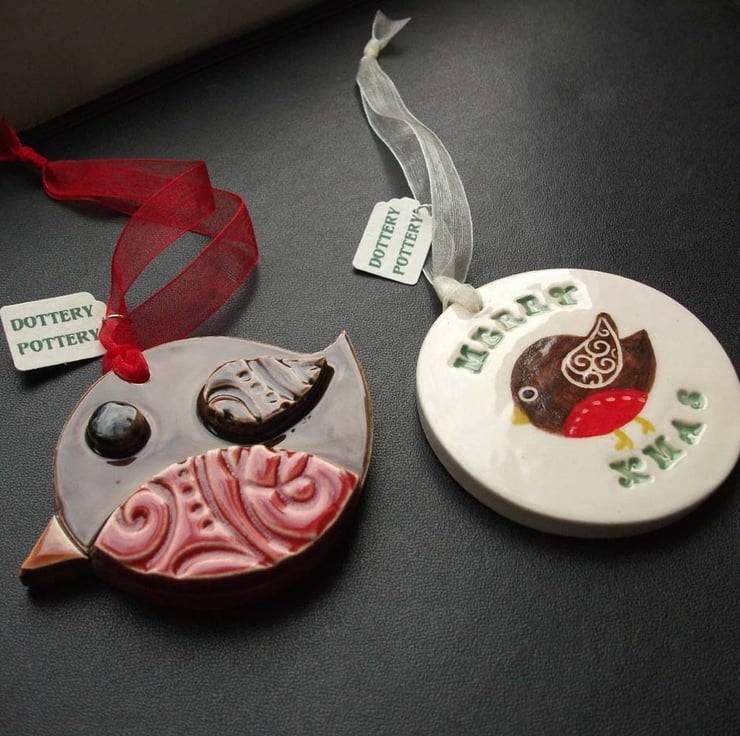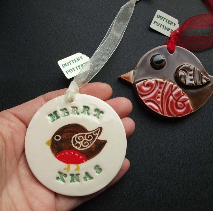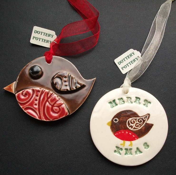 In this set there is one robin shaped decoration and one round decoration with an image of the robin painted onto it.