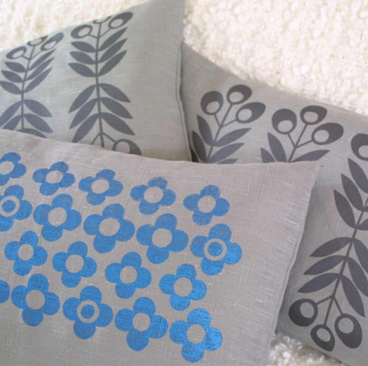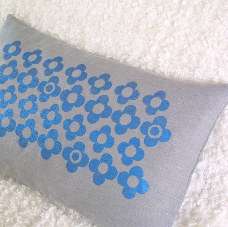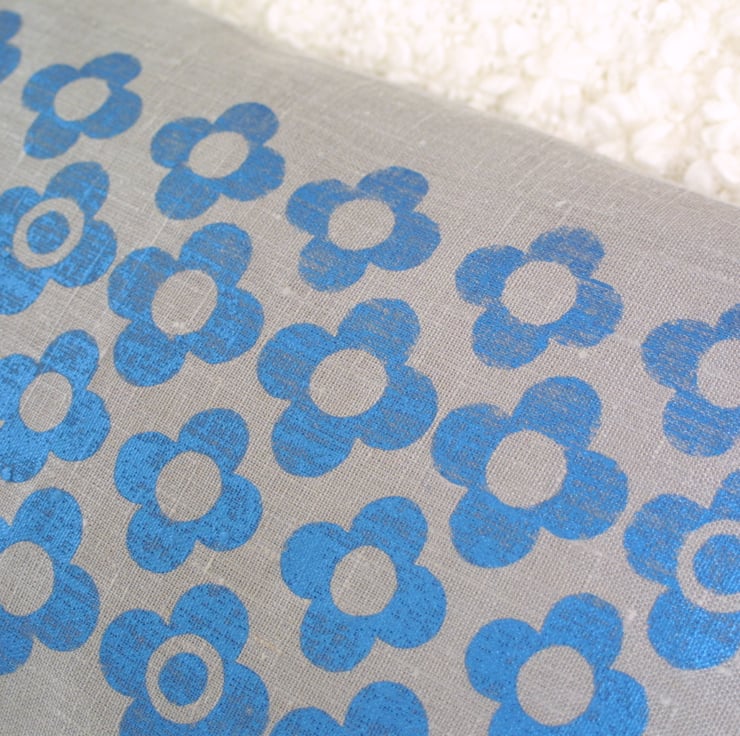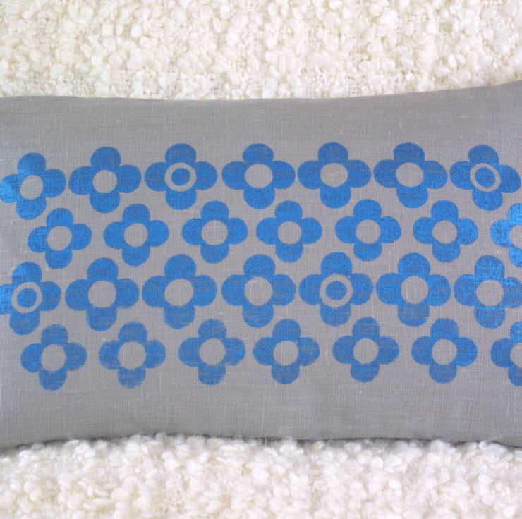 One of my own designs Mod Flower, screenprinted onto grey linen in a glistening Royal Blue. This ink is a metallic colour which gives a subtle sheen to the colour to catch the light.