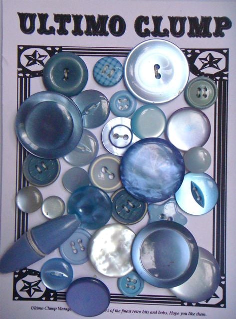 30 icey blue vintage buttons, all different shapes and sizes.