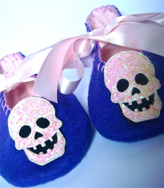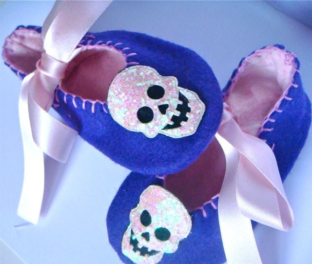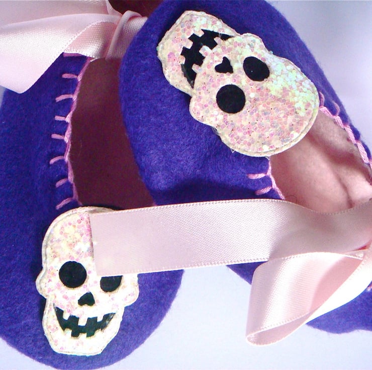 These are so cute, they have purple felt uppers and soles, are lined in pale pink felt, and are decorated with aglitter skull motif on each toe, pale pink ribbon ties, 9.5cm inside length and 5cm inside width.
