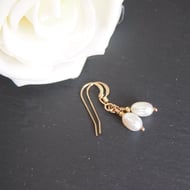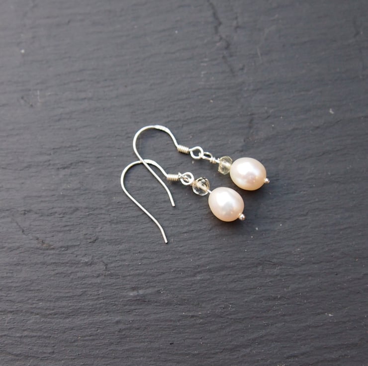 Simple and delicate freshwater pearl and citrine drop earrings on sterling silver ear wires. Approximately 38mm long.
