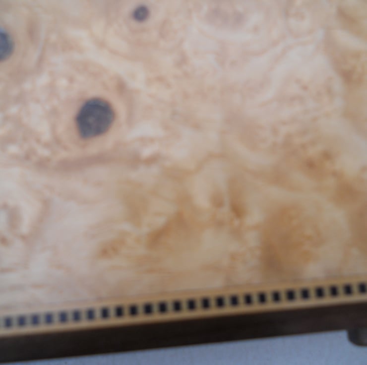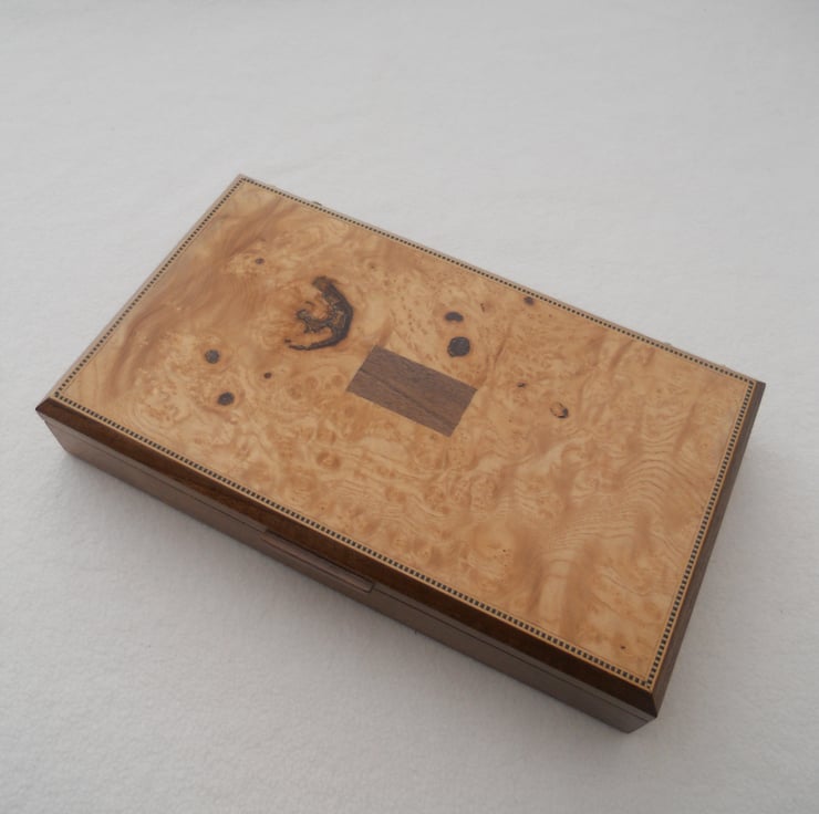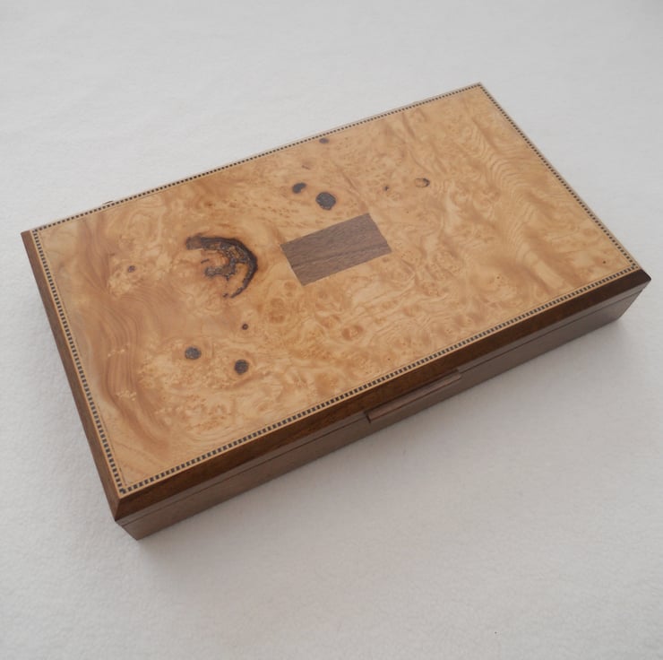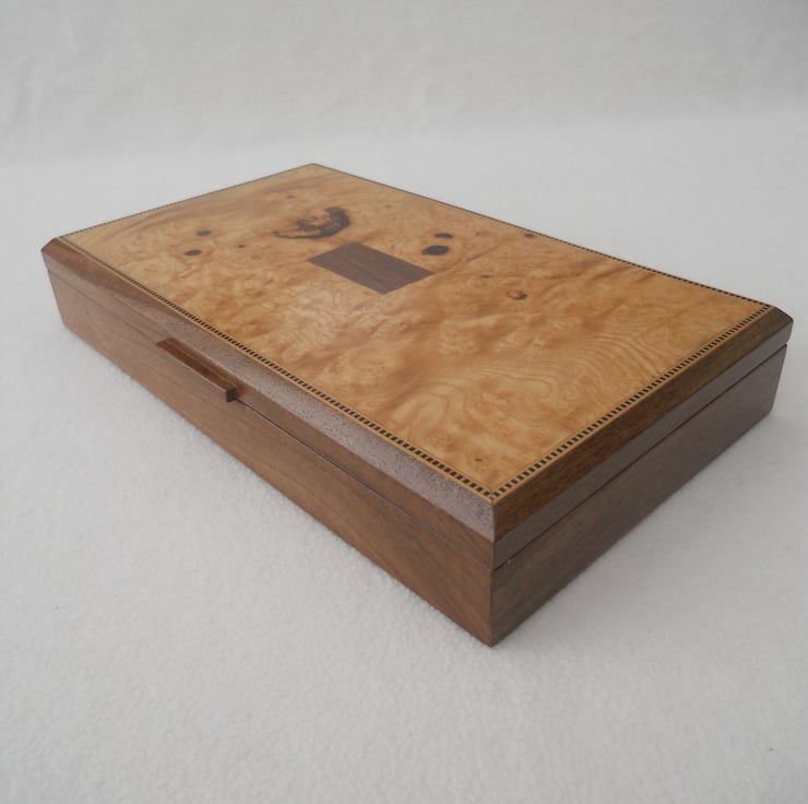 This solid walnut earring box has an Ash burr veneered top with an inlaid edge.