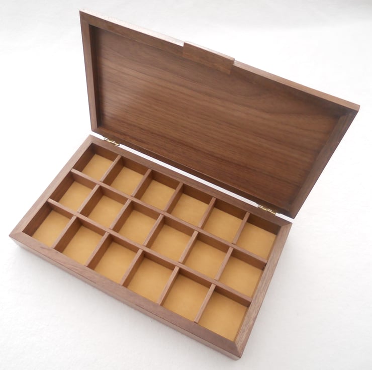 It measures 260mm x 150mm x 43mm and is partitioned into 18 compartments, the bottoms of which are lined in a mustard coloured suede/like material. The box is finished in a smooth clear laquer.