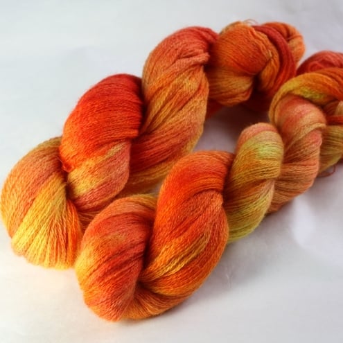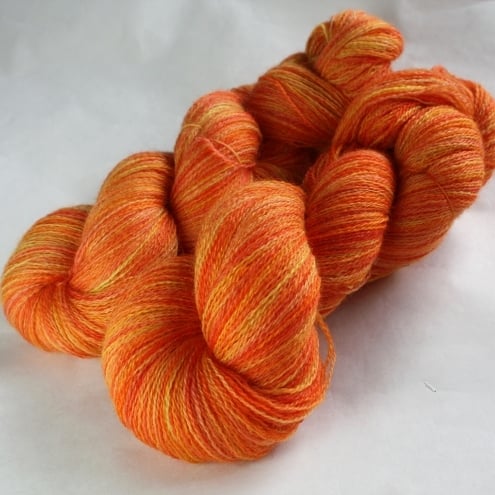 This fiery-coloured yarn in shades of bright orange and yellow was inspired by festivals associated with fire, such as Beltane, Samhain and Up-Helly-Aa. This yarn is lustrous, lofty and slightly fuzzy. It should make beautiful lace projects. It is reskeined as shown in the first two photographs but is shown before reskeining in the third photograph for reference only. There is one skein left.