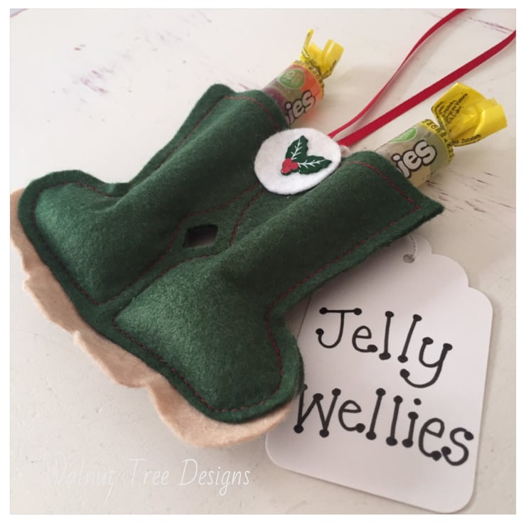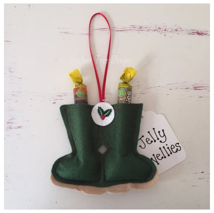 Re-fillable Christmas tree decoration, made from felt, and embellished with a holly motif.