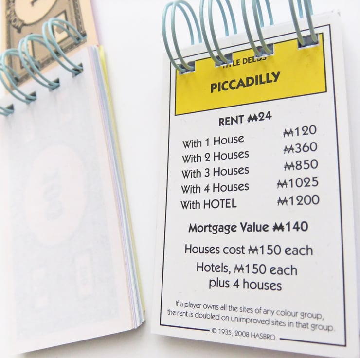The other notebook has a Picadilly property card as its front cover with approx. 30 pages of blank white FSC approved paper. The back cover is a Chance card.