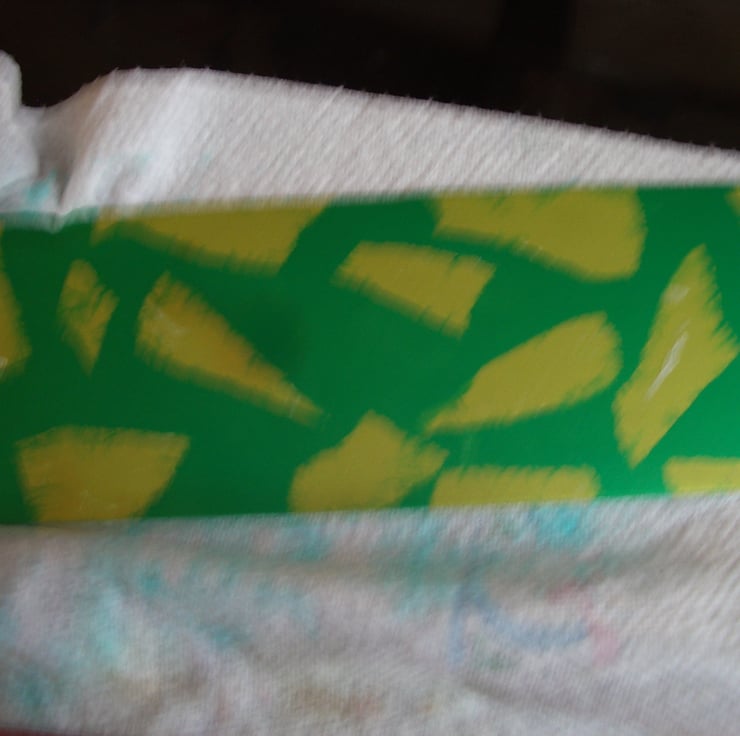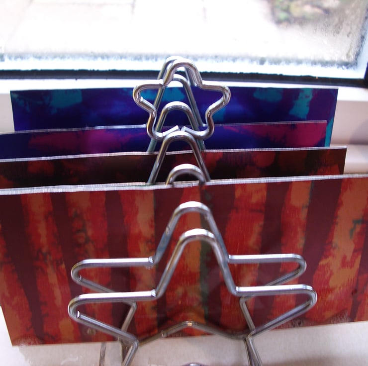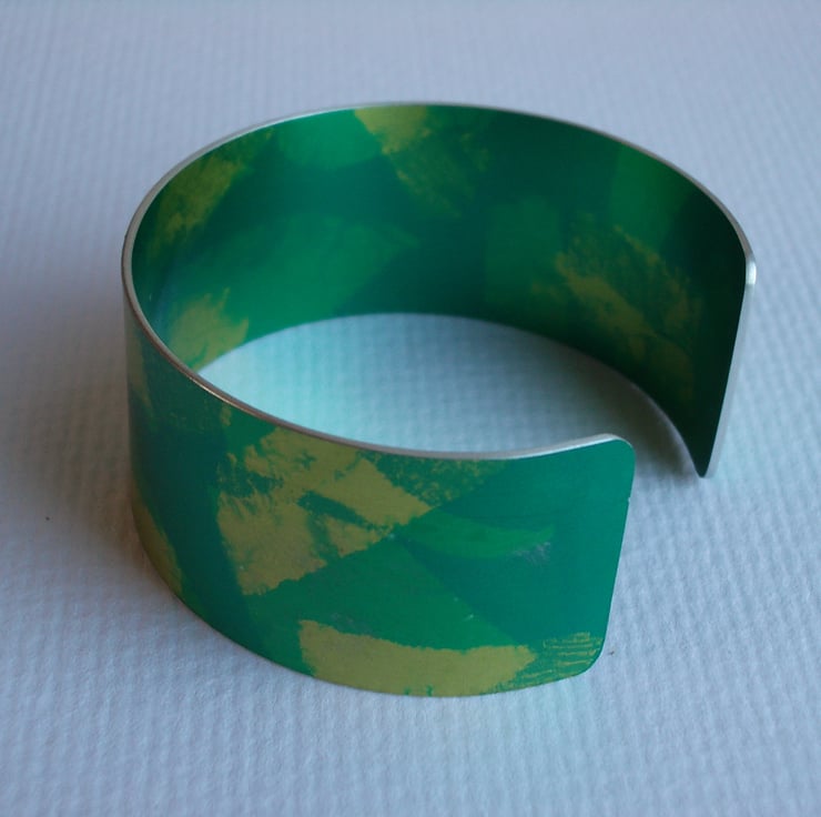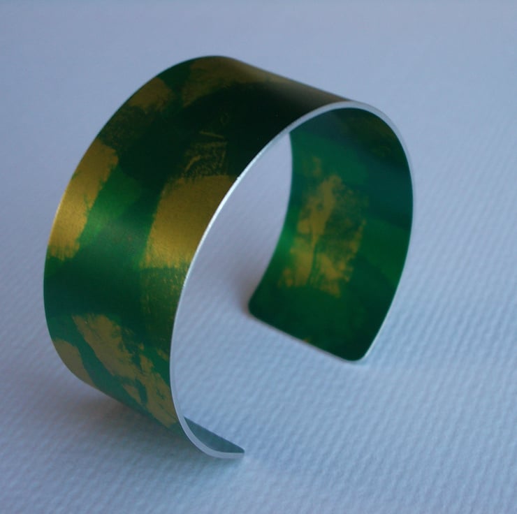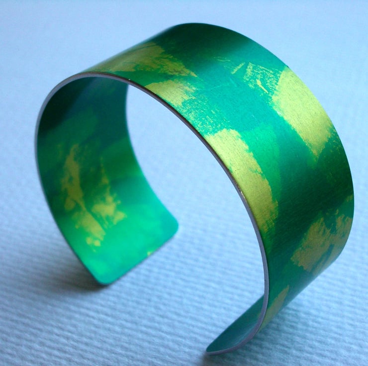 This striking jade green and gold cuff is made from aluminium which has been dyed in layers to achieve this abstract pattern. I then seal the dye so that it becomes a permanent part of the metal. The cuff shape is saw pierced by hand and then shaped around a mandrel. I then file and wire wool the edges so that they feel smooth and comfortable to wear.
