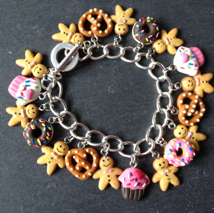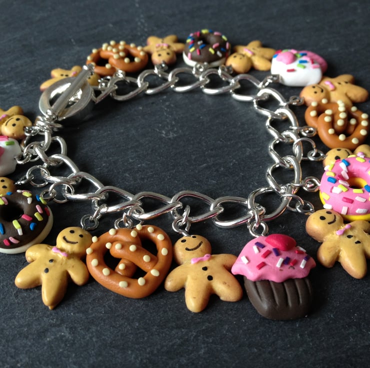 Evoke the childhood fairytale world of Hansel & Gretel with the tiny gingerbread men, cupcakes, donuts and pretzel hand made polymer clay charms which adorn this cute and kitsch silver plated curb link charm bracelet. The bracelet which measures 7.5 inches in length fastens with a toggle clasp and is sure to attract much attention - ideal as a stocking filler.