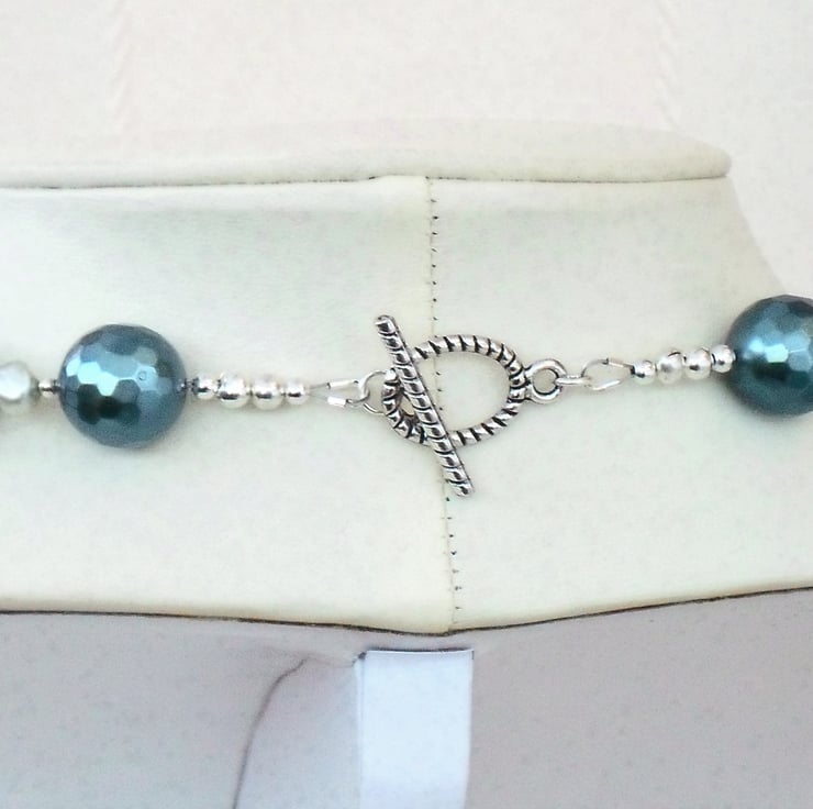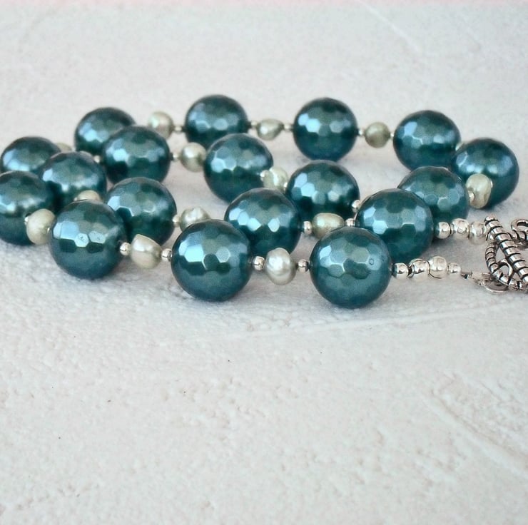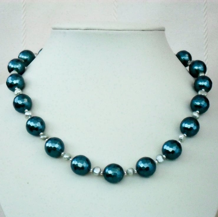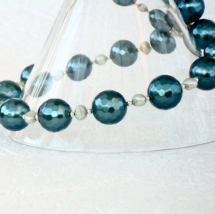 I have used these stunning deep green shell pearls, and inter-spaced them with small silvery-green pearls in making this necklace.