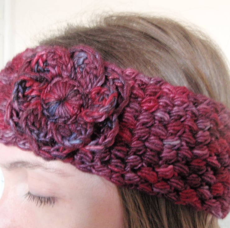 A gorgeous, on trend and handmade to my own pattern, crocheted ear warmer/headband; made from beautiful berry and purple mix coloured silk and extra fine merino wool mix yarn by Manos del Uruguay, ( 30% silk 70% extra fine merino wool ).