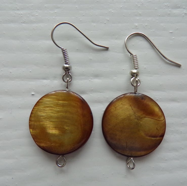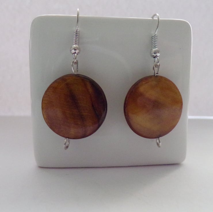 Shell Earrings, Brown Shell Earrings. Beautiful brown shell earrings on a hypoallergenic silver plated fishhook (perfect for sensitive ears). The shell bead is approximately 2cm in diameter.