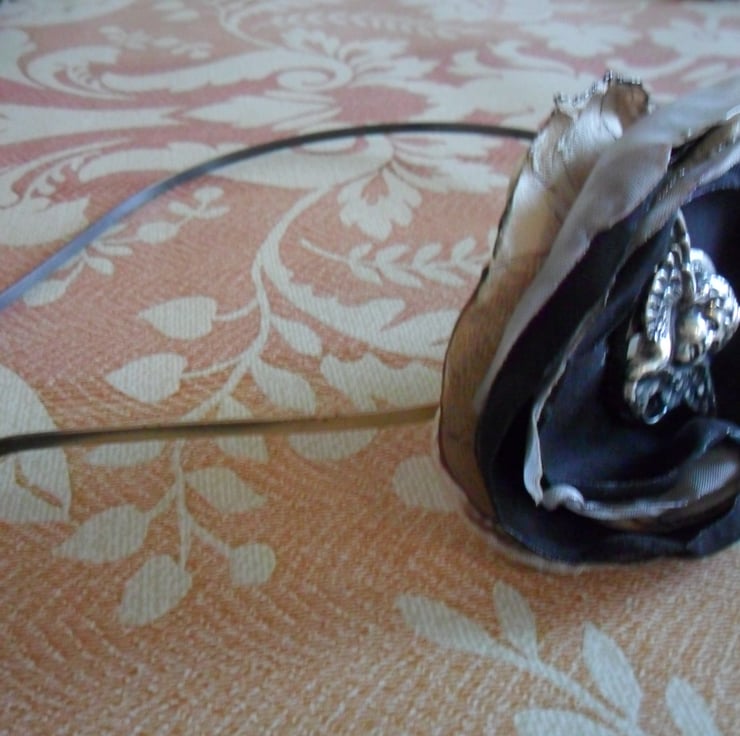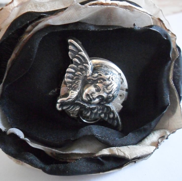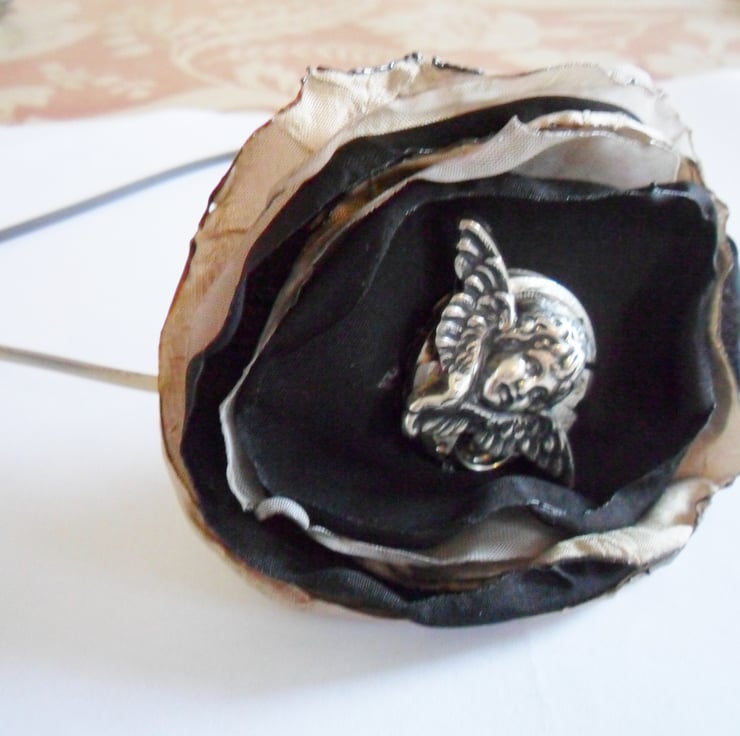 This Steampunk creation has a wonderful handmade corsage placed onto an antiqued finished head band, adorned with a silvertone Vintage style silvertone Angel.