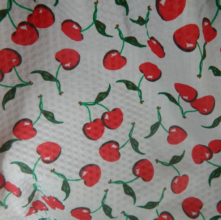 Here we have a lovely polycotton red and white (cherries pattern) retro style apron, handmade in house to our own design. (see photos). Adjustable waist ties so will fit up to a size 22.