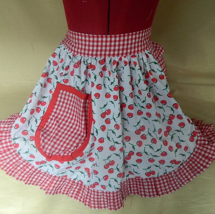 Vintage 50s Style Half Apron Pinny - Red & White - Cherries (Cherry)