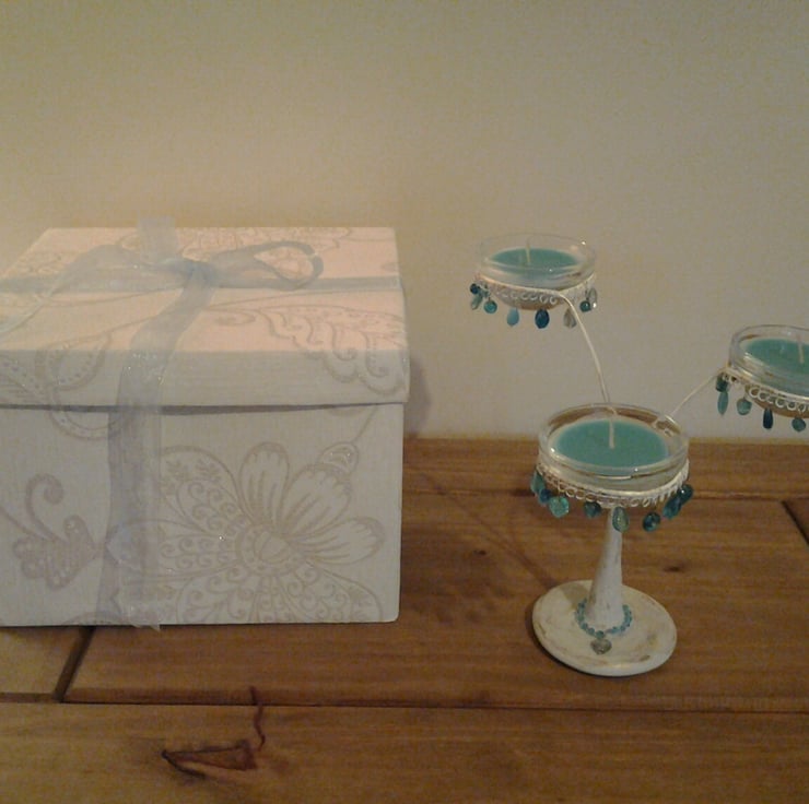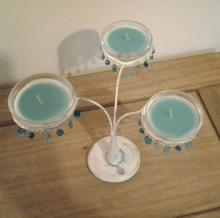This beautiful Candelabra has been made using thick steel wire rods and crafting clay for the base. The steel rods have been both wired and clued into position inside the clay base which also has a metal plate inside to give it weight and stability. The candelabra has been painted white and then brushed with gold paint to give it an antique vintage look. Each candle holder is circled with decorative blue glass beads and comes with three lovely geranium & mimosa scented candles in glass holders. The base also has a glass heart shape bead decoration.