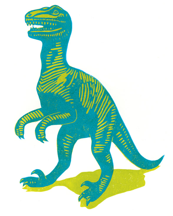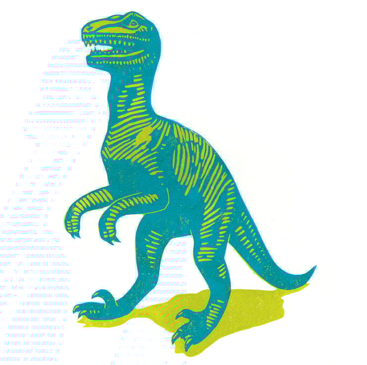 A3 (29.7cm x 42 cm) poster-print entitled 'Deinonychus!' printed in turquoise/teal and lime-green.