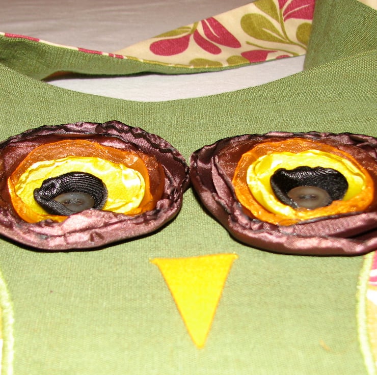 The bag is fully lined and its edges are piped for added detail. The eyes are layers of satin and voile to create a lovely feature to the bag.
