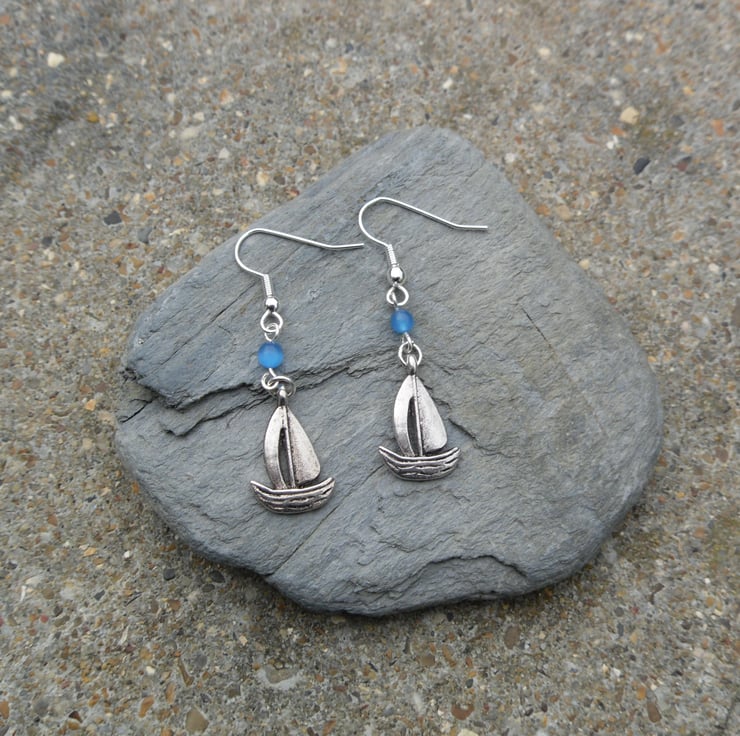 Silver colour yacht charm dropping from a small blue cats eye bead.