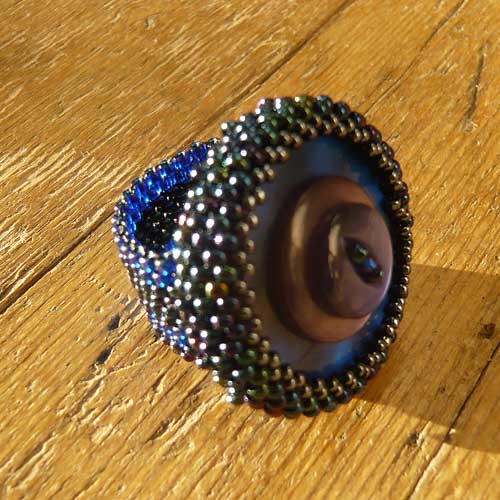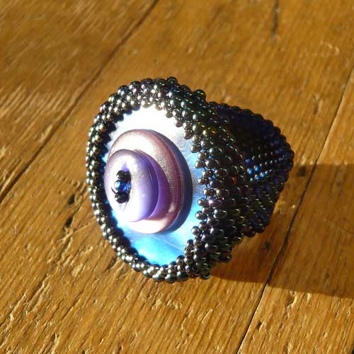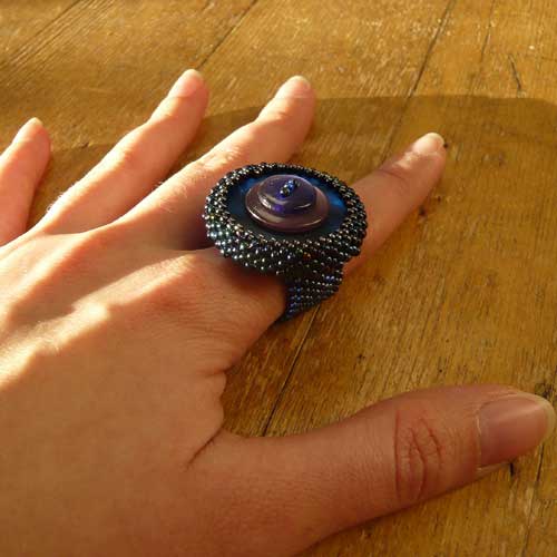 This ring is made of seed beads and vintage buttons. The ring is about 18 mm in diameter, UK size P (US size 7 3/4).