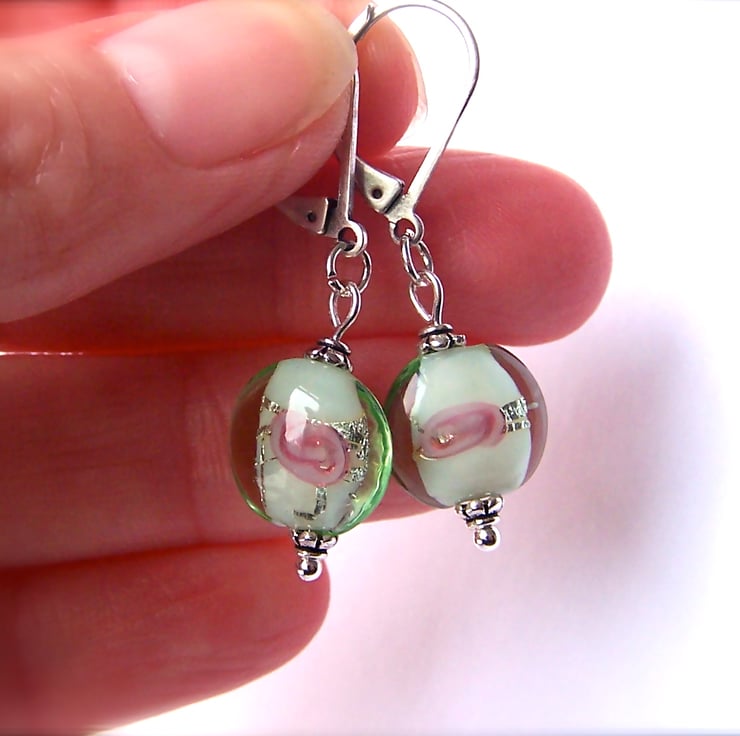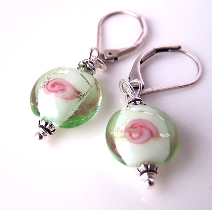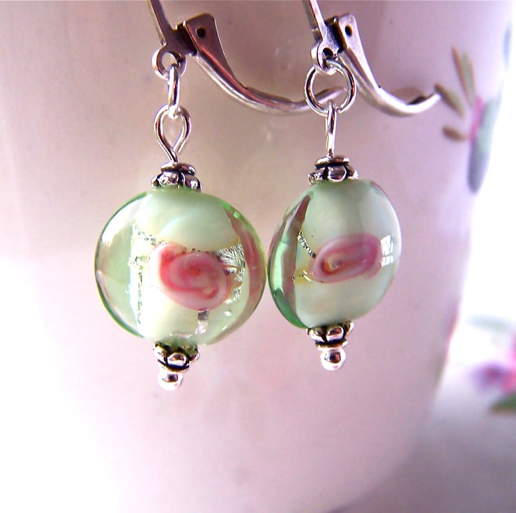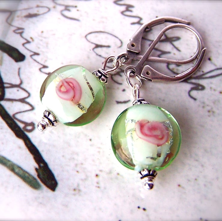 Sweet and dainty little earrings featuring beautiful rosebud beads in green, pink and white, with a touch of sparkle from the foil inside each bead.