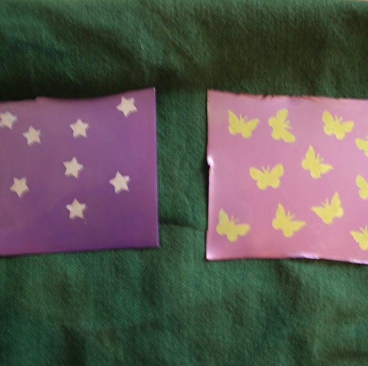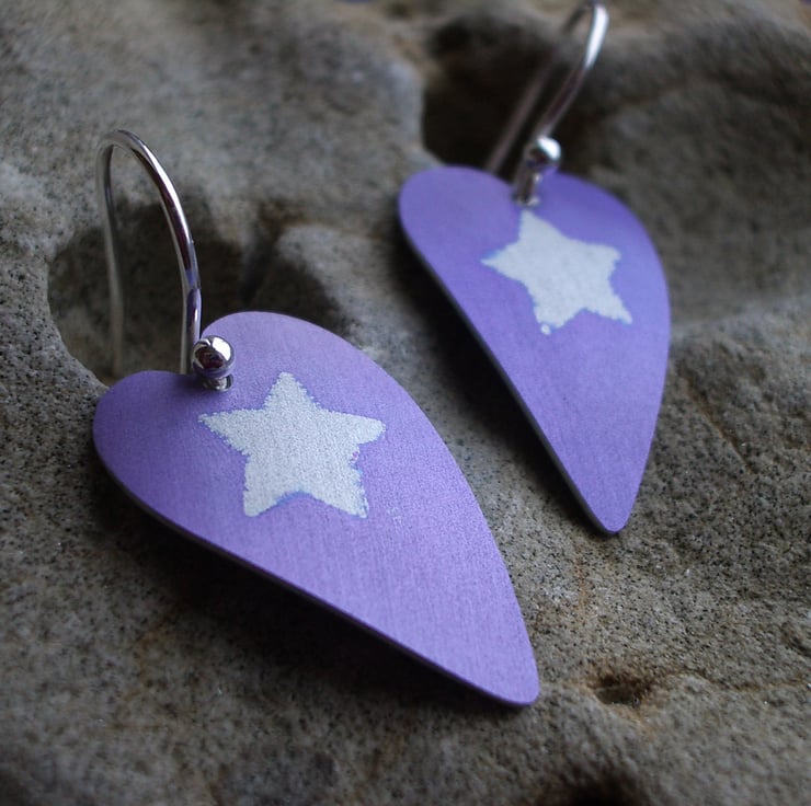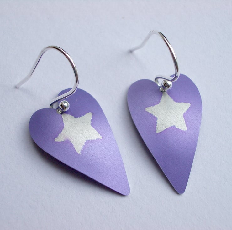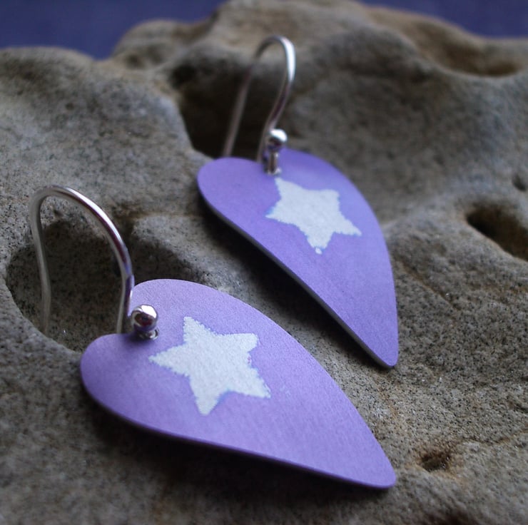 These heart earrings are made from aluminium which I have dyed in a mix of colours achieving a dusky purple background with silver stars. I then seal them so that the dye becomes a permanent part of the metal. I cut out the heart shapes by hand, using a piercing saw, then dome them so that they catch the light.