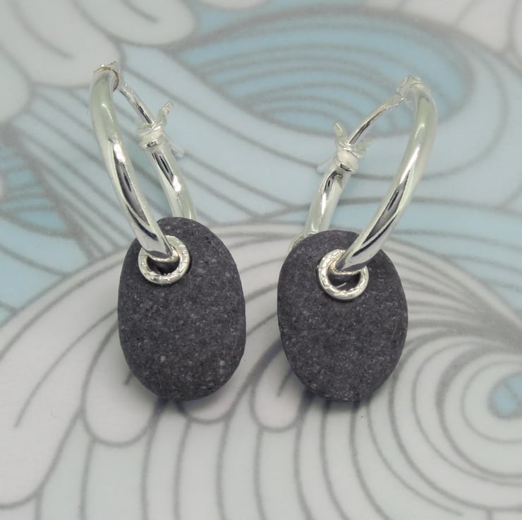 These natural earrings are made from pebbles that we have collected from the east coast of Yorkshire. They hang from quality, hallmarked, sterling silver sleepers that are 18mm in diameter and the drilled holes in the pebbles are hidden by little textured silver rings on the front and back. Because these are natural pebbles, they may vary slightly from the ones shown but we try our best to get them as similar as possible. The pebbles measure approx. 12mm tall and 2mm thick. These natural stone earrings come in one of our branded gift boxes.