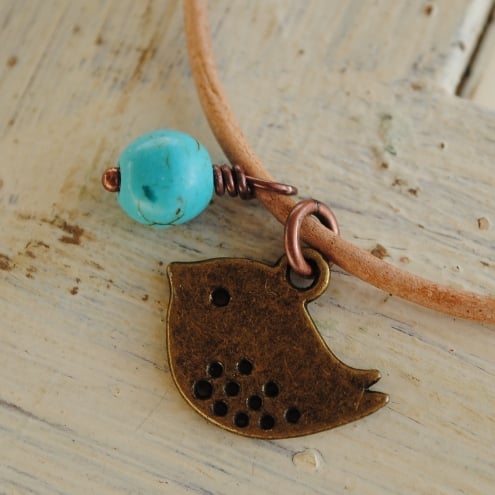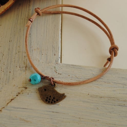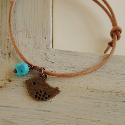 A simple cord friendship bracelet made with natural leather cord, a copper bird and a semi-precious turquoise stone bead. The bracelet is adjustable as it is finished with a slide knot fastening at the back, however the sizing is designed primarily to fit the older child / teenage / smaller adult wrist.