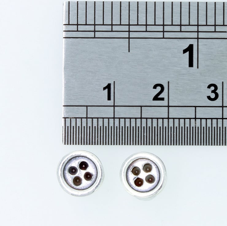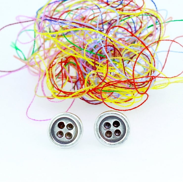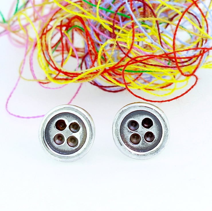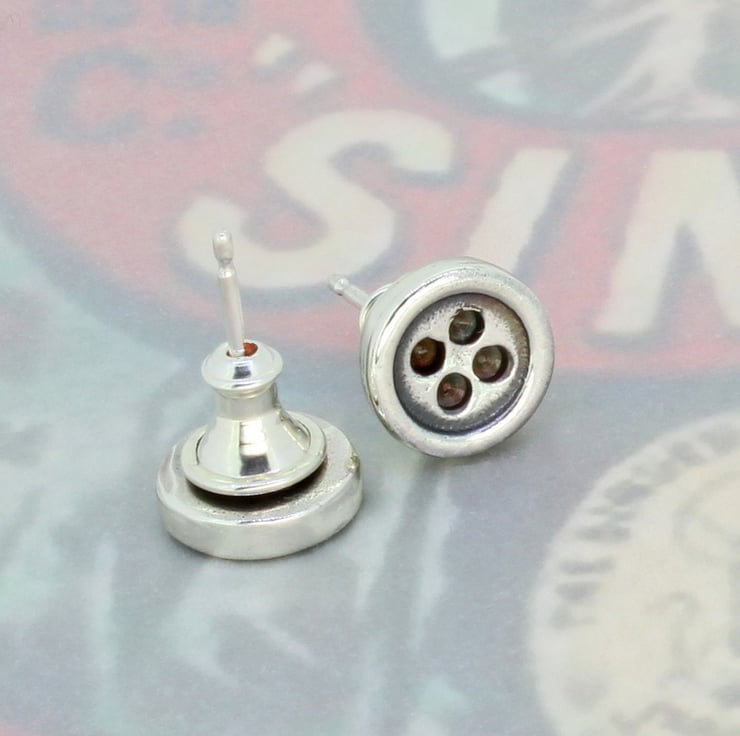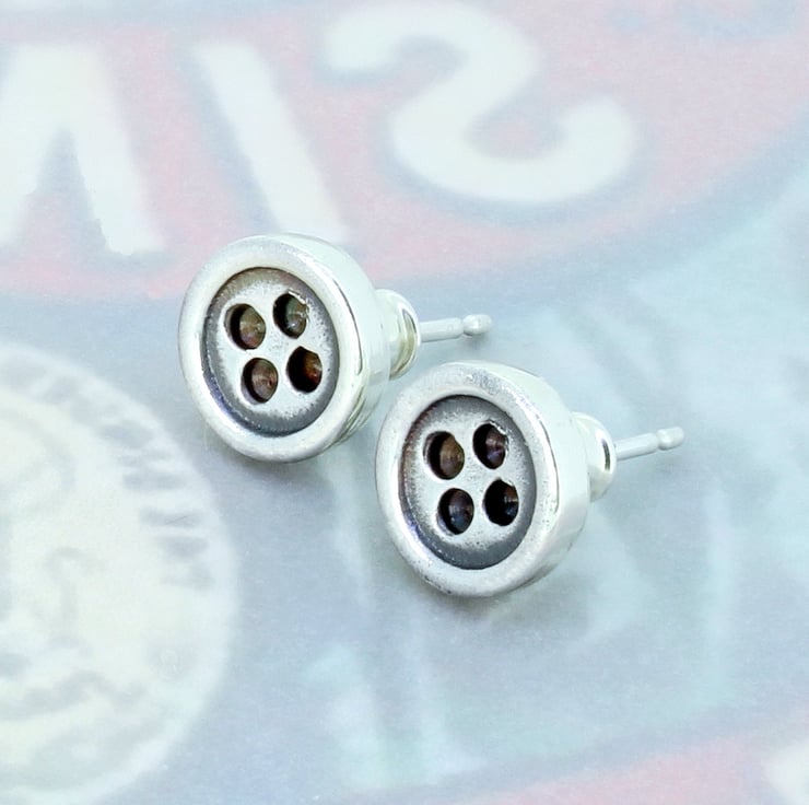 These cute, silver button ear studs are made from solid sterling silver. The ear studs have been oxidised and then polished to accentuate the shape and the detail. The buttons measure 8mm in diameter and have sterling silver posts and backs. We also make matching button cufflinks.