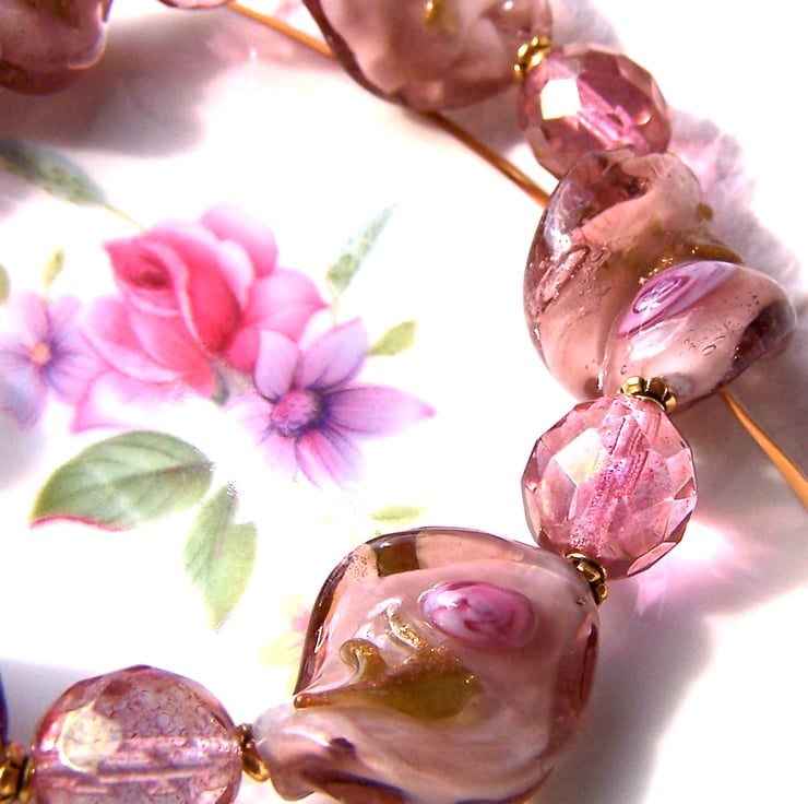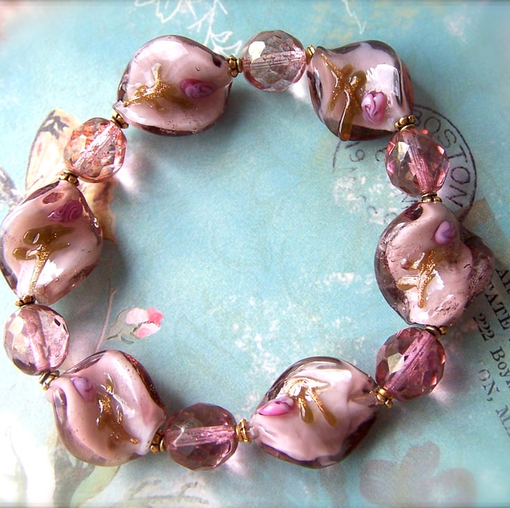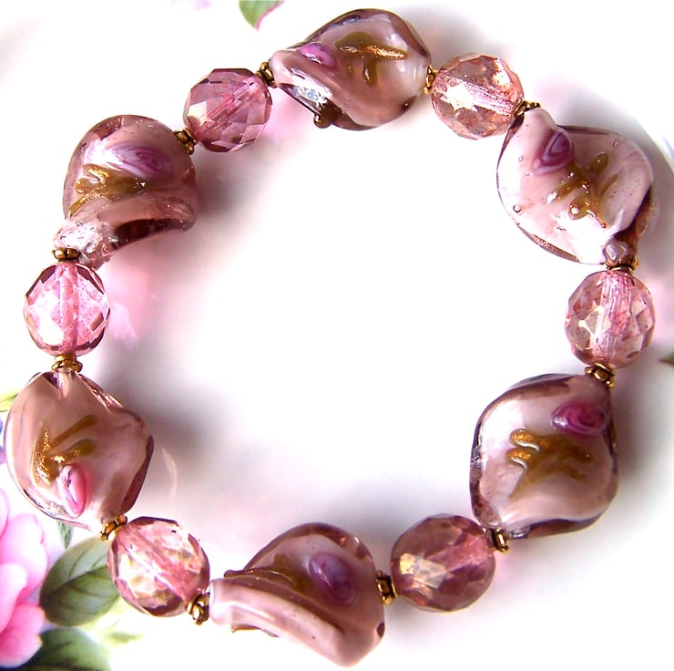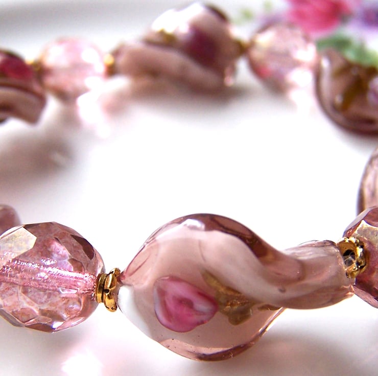 The larger beads in this bracelet are twisty lampwork beads in a lovely shade of dusky rose pink. They are decorated on both sides with a flower pattern in pink and gold.