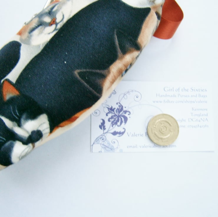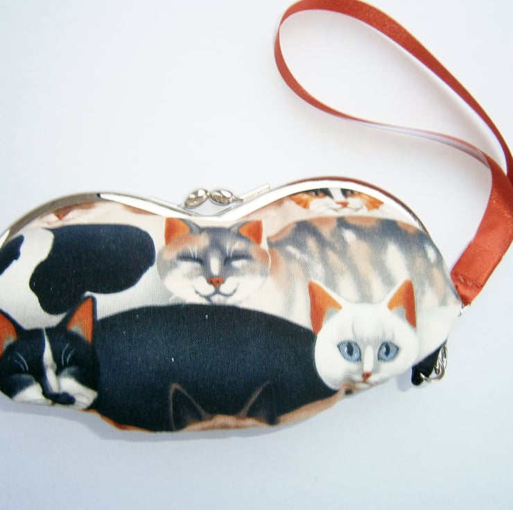 Charming little wristlet purse for sunglasses or mobile phone in pretty cats fabric with removable wrist strap in contrasting fabric Measures 7x 3
