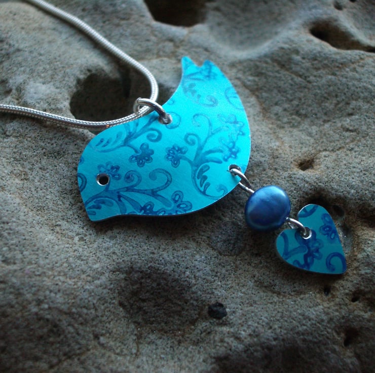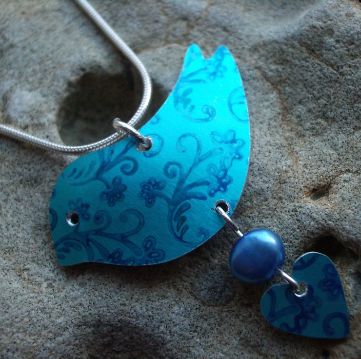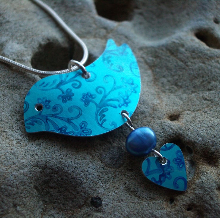 This striking bird pendant has been made from aluminium which I have dyed and printed with a pretty floral pattern. I then seal the dye so that it becomes a permanent part of the metal. I cut the bird shape out by hand using a piercing saw. I have added a small blue freshwater pearl on a sterling silver wire which is attached to a printed heart.